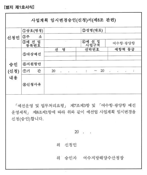 ② 제1항에 따라 다른 항으로의 예선지원을 하려는 예선업자는 별지 제1호 서식의 사업계획 임시변경승인 신청서를 청장에게 제출해야 한다.