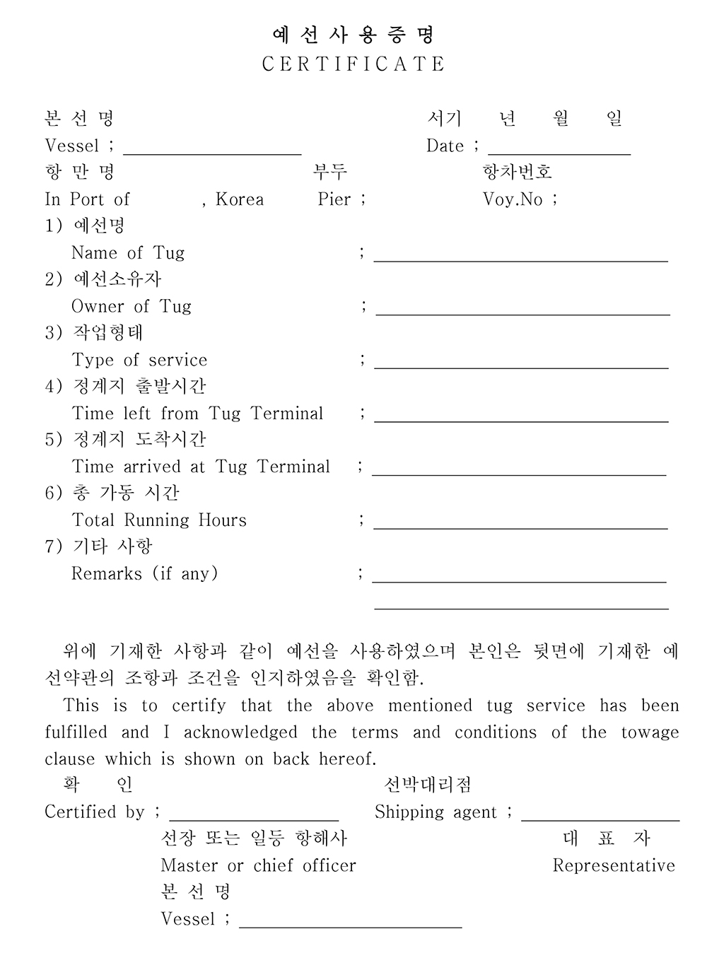 ①예선사용자는 예선업자가 제시하는 예선사용증명서에 소정사항을 기입하고 서명을 하여야 한다.